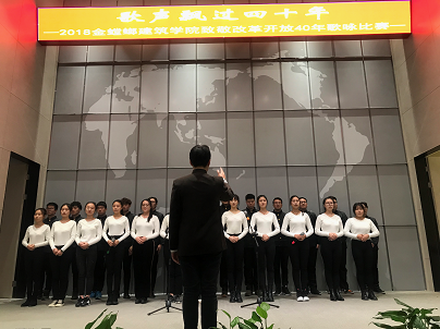 12月5日下午两点,“歌声飘过四十年”——致敬改革开放四十周年歌咏比赛在梦溪厅正式拉开帷幕,师生同台,放声歌唱祖国40年来取得的辉煌成就,抒发心中的无限激情。学院党委副书记(主持工作)陈国凤老师,副院长茆汉成老师、建筑系张晓峰、叶露老师、风景园林系马建武、付晓渝老师,本科生班主任王珲、田雅丝、王杰青、吴捷、郑丽以及教工党支部全体老师等应邀出席,学院各党支部、各班团支部以及教职工代表共300余人参加了此次歌咏比赛活动。