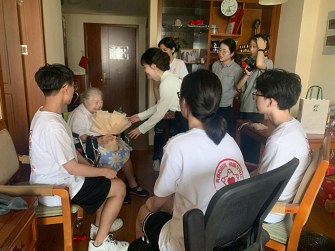 在“青春心向党,情暖夕阳红”团队登门拜访时,87岁的盛锦云向团队成员讲述了自己的从医经历以及作为党员的责任担当,并对当代青年予以勉励。她亲切地问候了每一位团队成员的姓名、家乡和所学专业。盛奶奶感慨道,现在的时代很好,我们的生活和平幸福,这样的和平年代是前辈们用热血和奉献换来的。希望同学们怀着感恩的心,珍惜时光,拼搏奋斗,绽放青春之花。