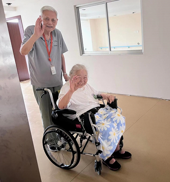 实践团队离开时,盛锦云依依不舍地与众人告别。虽然她腿脚不便,但依旧让老伴推着她的轮椅,坚持将团队成员送到电梯口,目送队员们离开。她的笑容灿烂又慈祥,目光中充斥着对后辈的关怀与厚望。