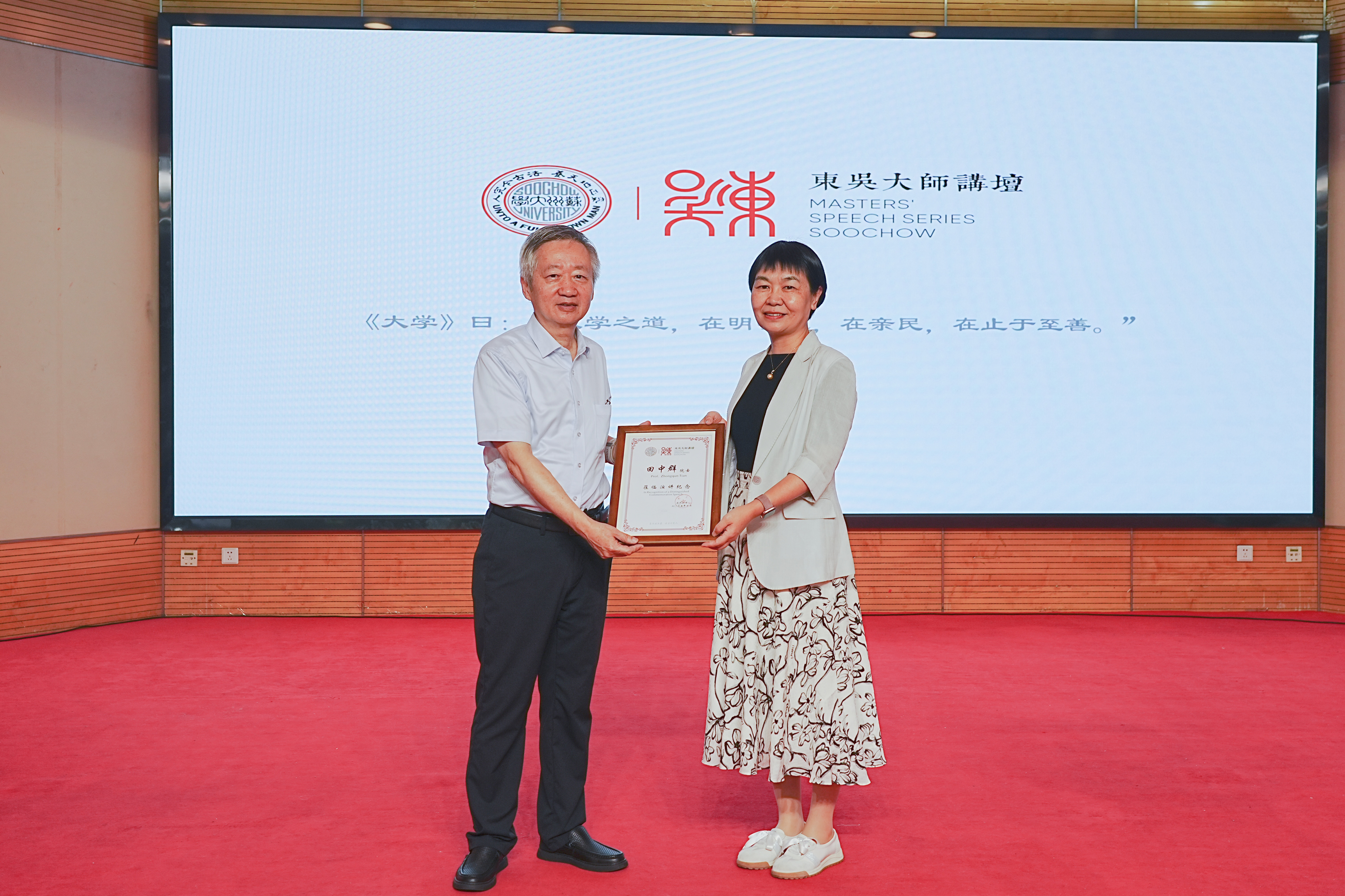 党委教师工作部部长林萍代表学校向田中群赠送了“东吴大师讲坛”纪念证书。