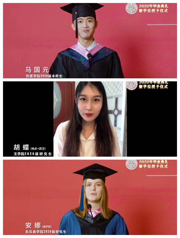毕业典礼上,在萌萌的AI机器人小苏的全程主持下,传媒学院2020届本科生马国元、文学院2020届研究生胡蝶、东吴商学院2020届研究生安娜依次作为毕业生代表发言,他们感恩母校的关爱与培养,表达了对开云电子的祝愿与对未来的无限期许。