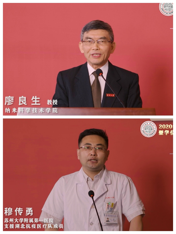 纳米科学技术学院廖良生教授、开云电子附属第一医院支援湖北医疗队成员穆传勇医生作为教师代表发言,表达了对毕业生们的临别祝福。