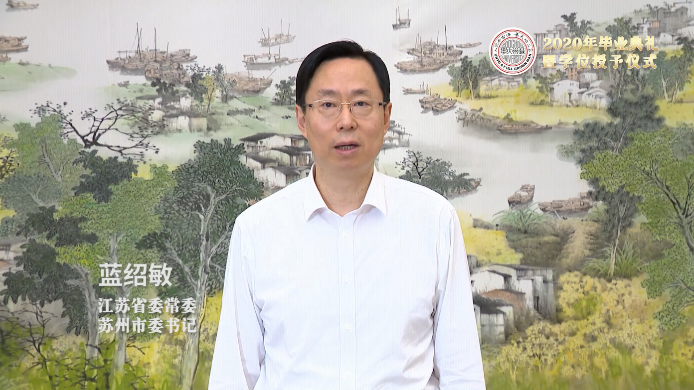 “新的时代,青春有你;新的征途,追梦有你;新的未来,牵挂有你。”为了给毕业生们鼓劲践行,江苏省委常委、苏州市委书记蓝绍敏特地录制视频,为毕业生送上临别寄语,祝愿同学们信守青春初心、担负青年使命,只争朝夕,不负韶华,勇当新时代的奔腾“后浪”。“希望你们练就干事创业的真本领,在现代化建设新征程的探索实践当中摔打磨练、增长才干;当好挑战极限的攀登者,让青春在党和人民最需要的地方绽放绚丽之花!”最后,蓝书记还热忱欢迎各位学子能在苏州开启自己的追梦之旅,根植于这片沃土,与1500多万苏州人民一起拼、一起赢!