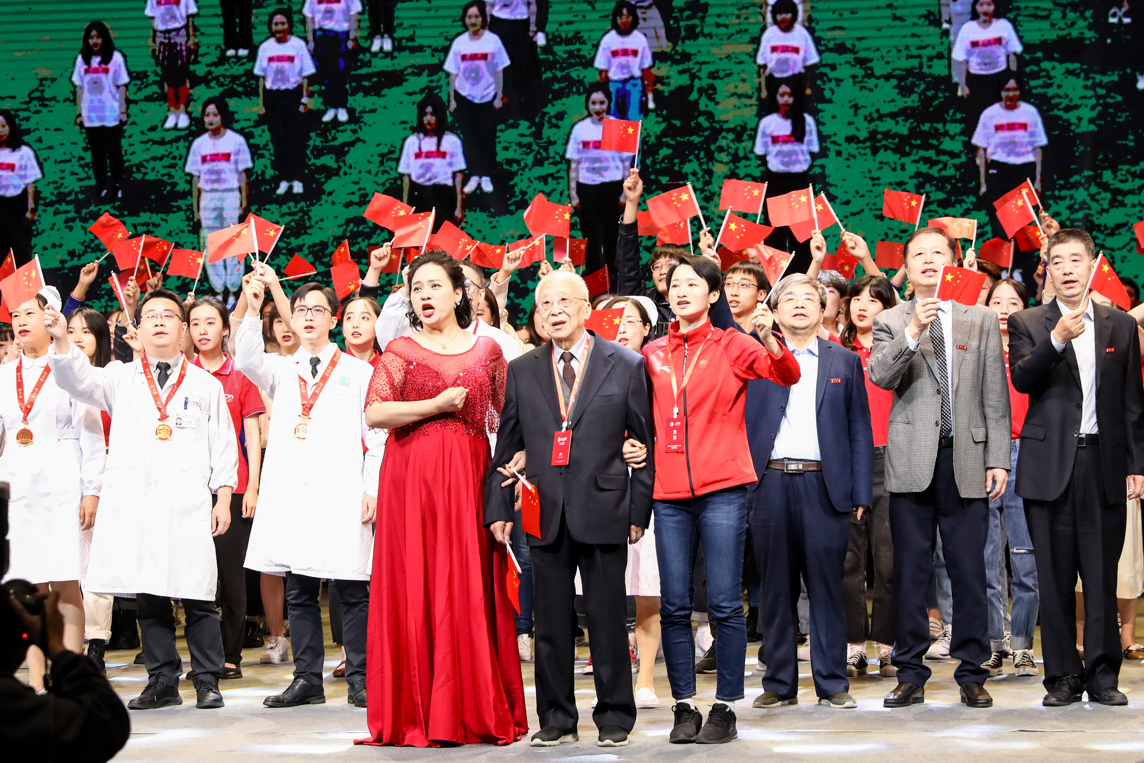 " 一条大河波浪宽,风吹稻花香两岸 ……"随着歌曲《我的祖国》响起,再次将发展大会的现场推向高潮。会场中,已90岁高龄、从事科研工作 68 年的中国工程院院士、开云电子现代光学研究所研究员潘君骅起身领唱。随后,奥运冠军、开云电子校友吴静钰挥舞国旗起身歌唱。开云电子音乐学院声乐系老师、江苏省音乐家协会会员董艺媛的女高音激昂澎湃,点燃全场!