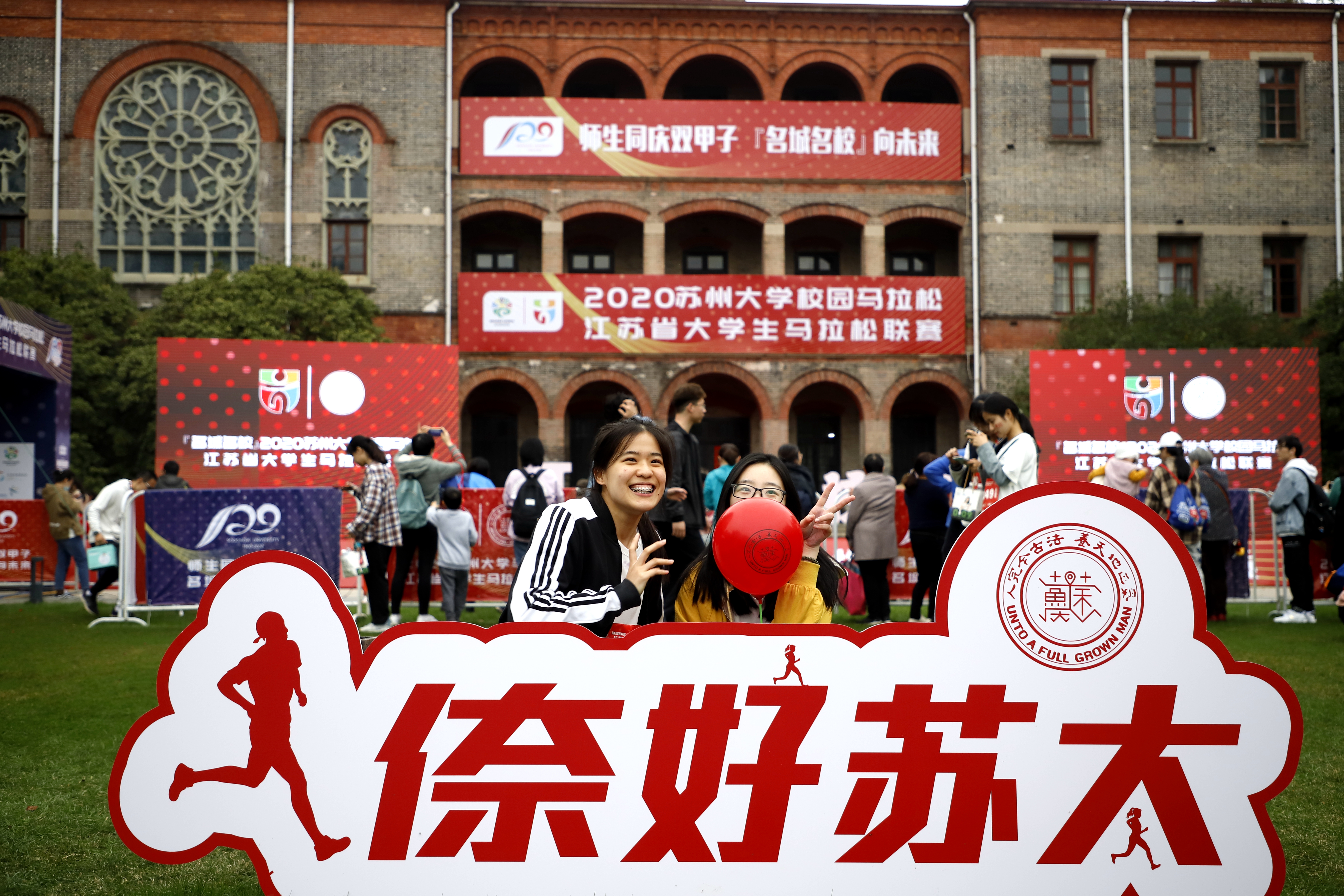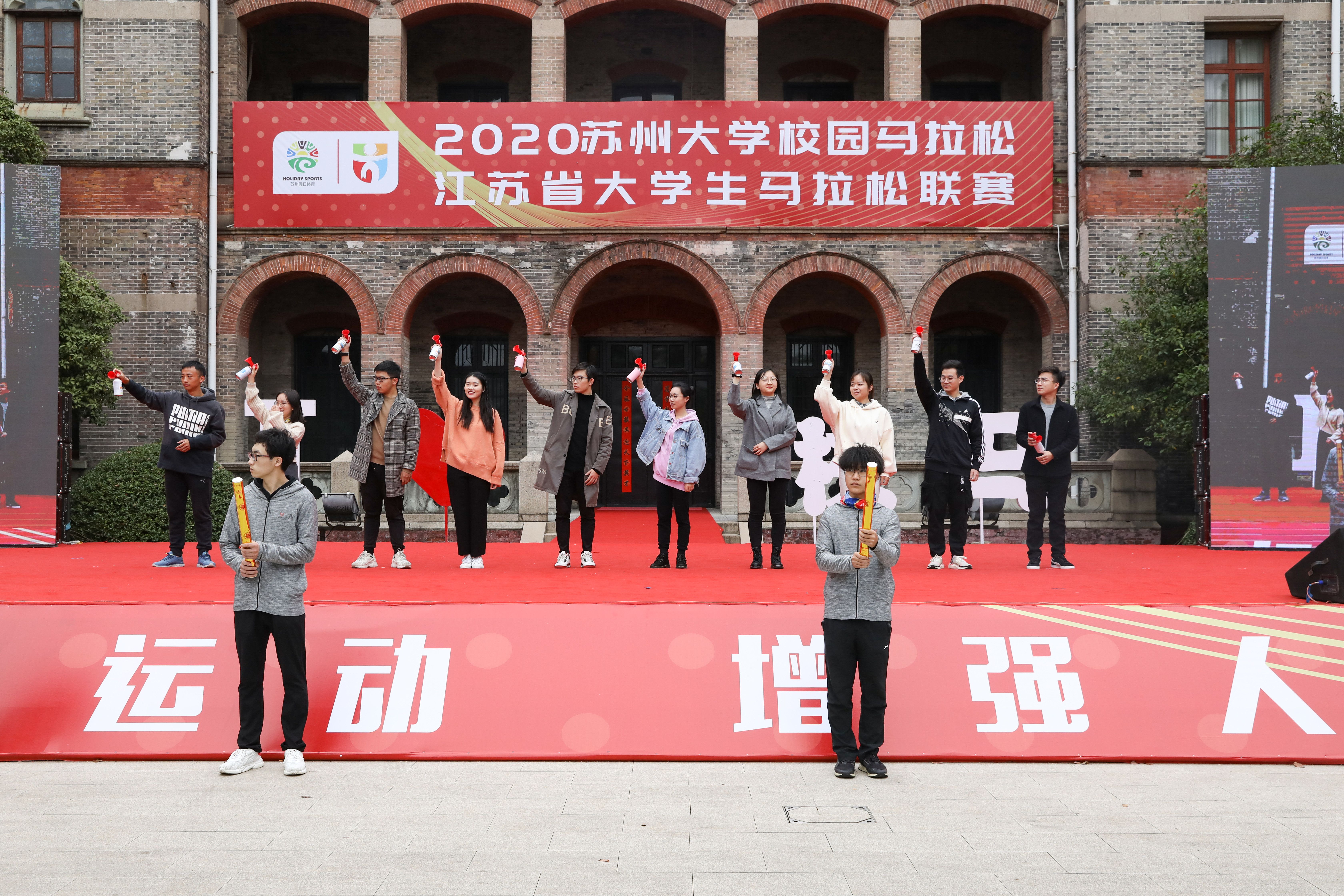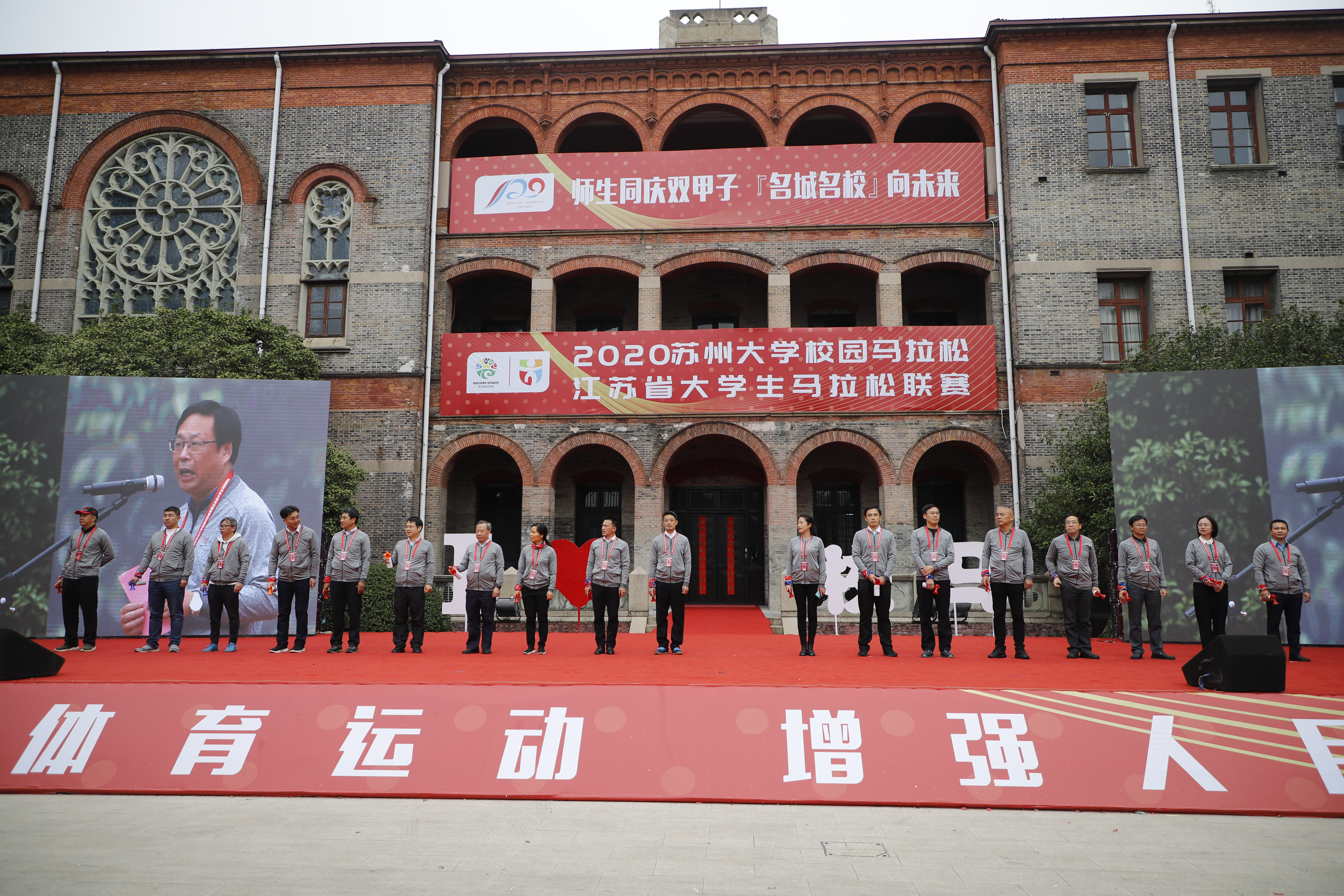 “师生同庆双甲子,名城名校向未来!”在激动澎湃的音乐声中,出席活动的领导和嘉宾入场,并为2020开云电子校园马拉松赛暨江苏省大学生马拉松联赛的十公里赛和半程赛发枪。