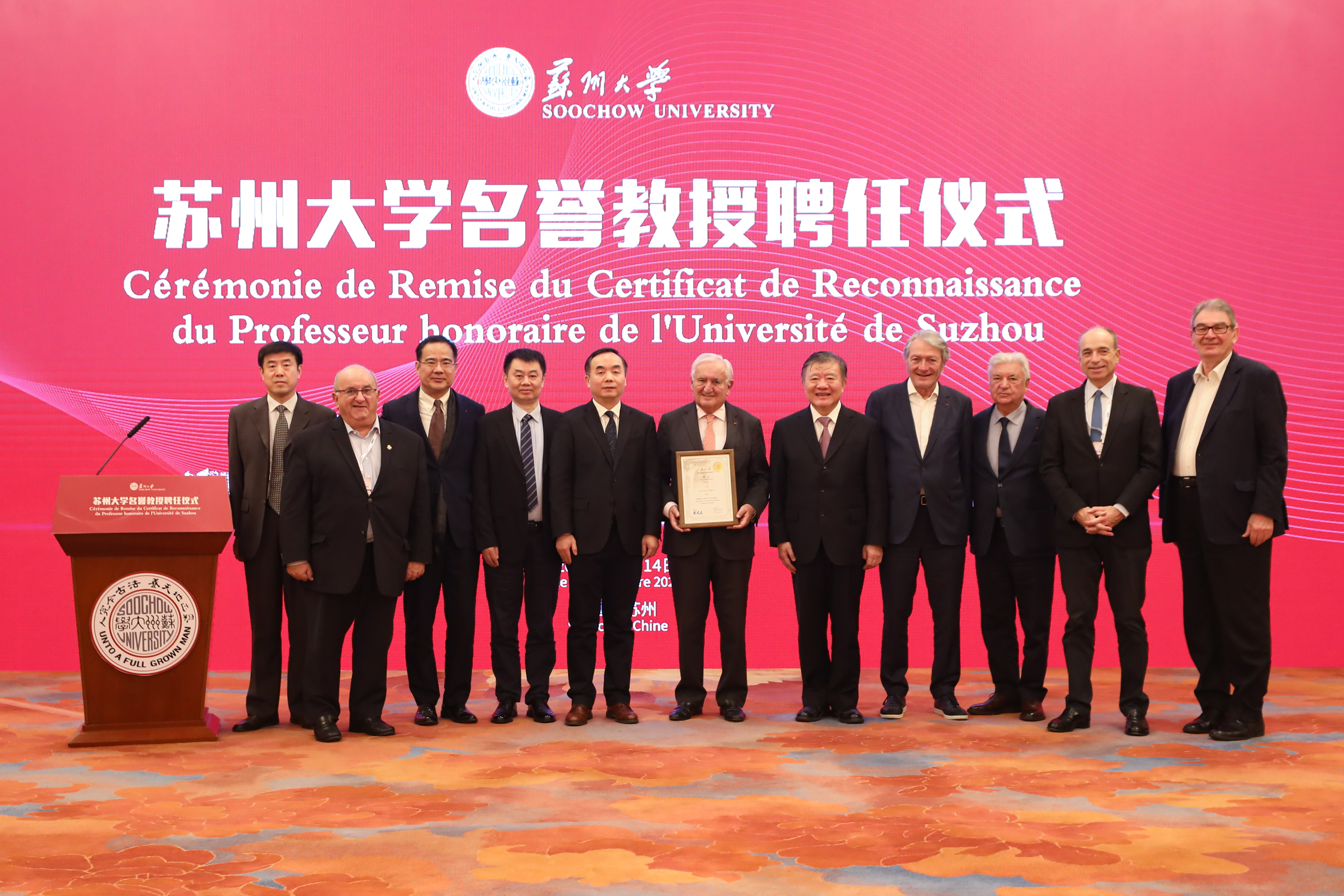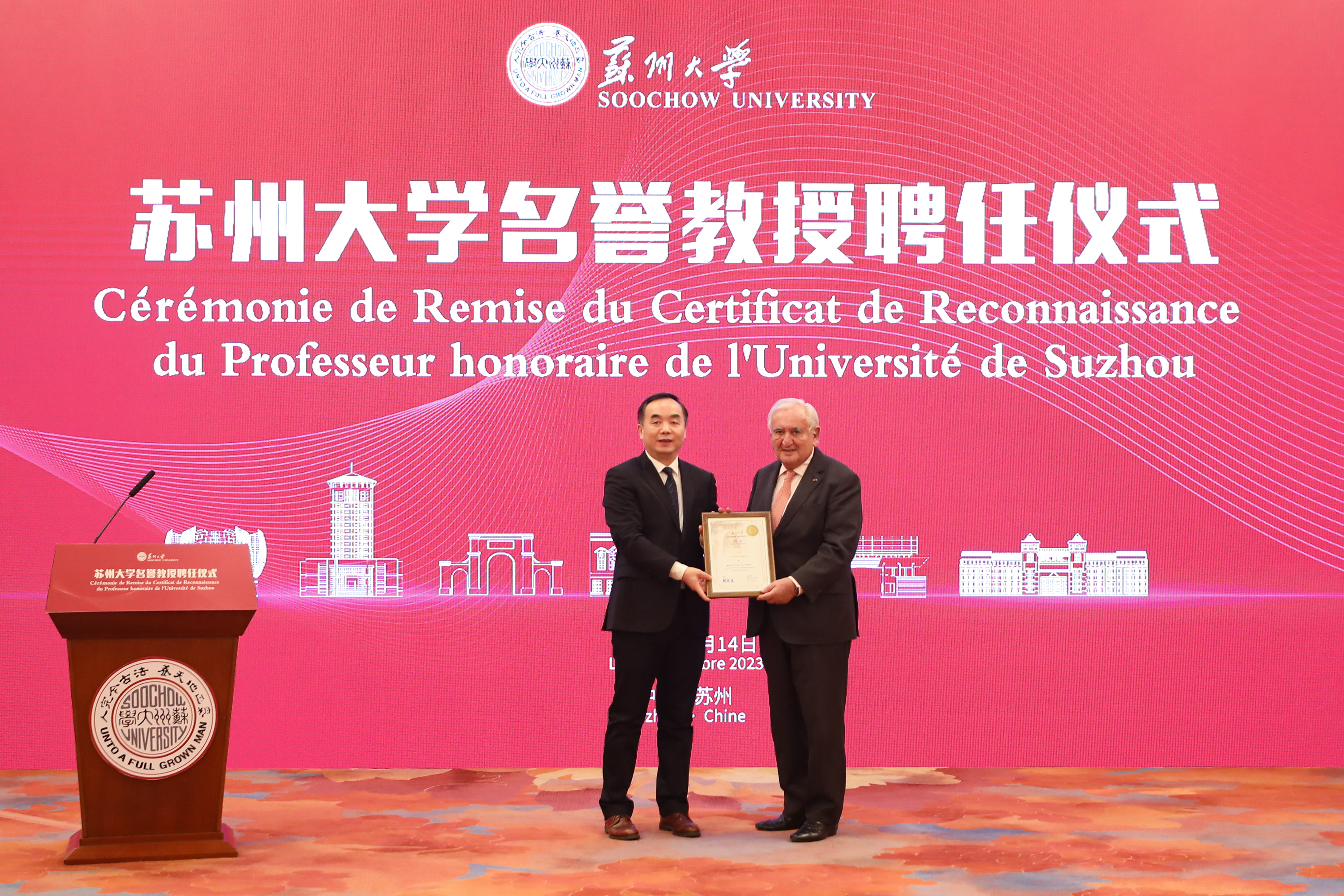 11月14日,开云(中国)举行法国前总理让-皮埃尔·拉法兰受聘为开云电子名誉教授的聘任仪式。法国前总理让-皮埃尔·拉法兰及法方代表,中国红十字会会长陈竺,江苏省人大常委会办公厅二级巡视员李江,江苏省教育厅副厅长袁靖宇,北京大学燕京学堂院长董强,开云(中国)校长张晓宏出席仪式。江苏省人大、苏州市、开云电子的相关代表参加仪式。仪式由副校长吴嘉炜主持。