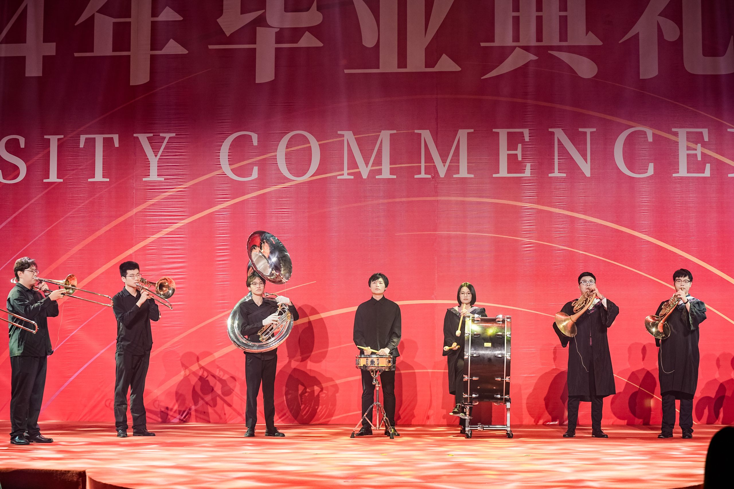 毕业典礼暨学位授予仪式在庄严的国歌声中拉开帷幕,全体出席人员起立唱国歌。