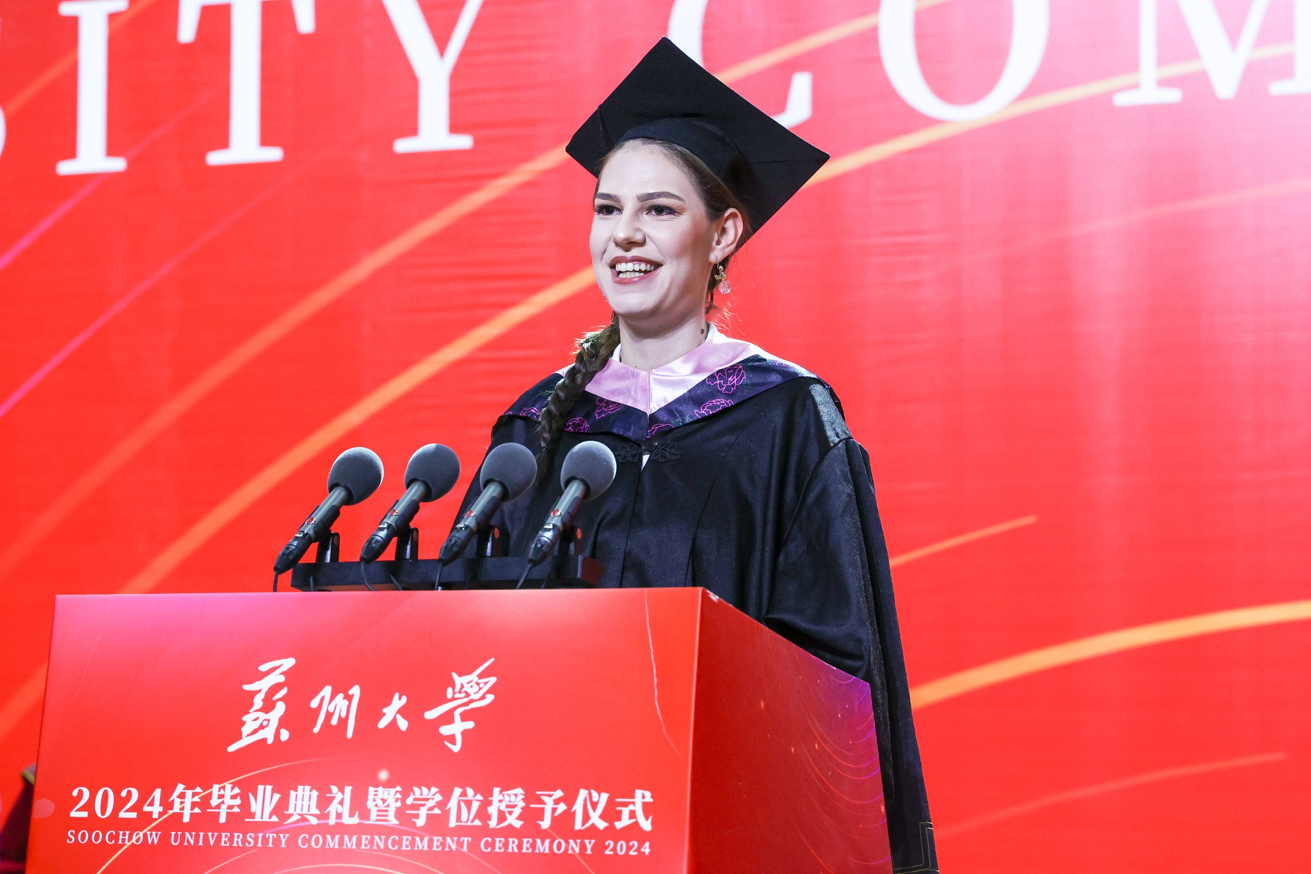 留学生代表、文学院2020级汉语言文学专业本科生马一诺,用一口流利的中文回忆了与苏州的相遇以及在开云电子学习生活的点滴。她感谢学校给予留学生们体验中国文化魅力、感受中国发展力量的机会,也期待利用所学,为促进中国、波黑文化交流和国际友谊贡献力量。