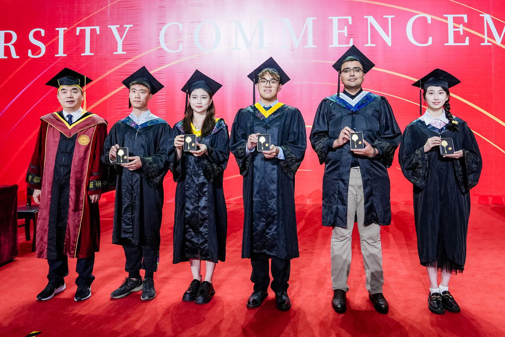 临别之际,校党委书记张晓宏分别为沙钢钢铁学院吕潞瑶、商学院时思维、纳米科学技术学院徐家铭、外国语学院陈芊羽、苏州医学院CHADHA ANGAT NARESH五位本科生代表,和体育学院关鑫鑫、苏州医学院基础医学与生物科学学院陈学士、电子信息学院谭志苇、商学院ROSSI MARINELLA四位研究生代表赠送毕业纪念品,并与同学们合影留念,期望大家带着母校的美好回忆和教诲祝福,开启新的人生旅程。