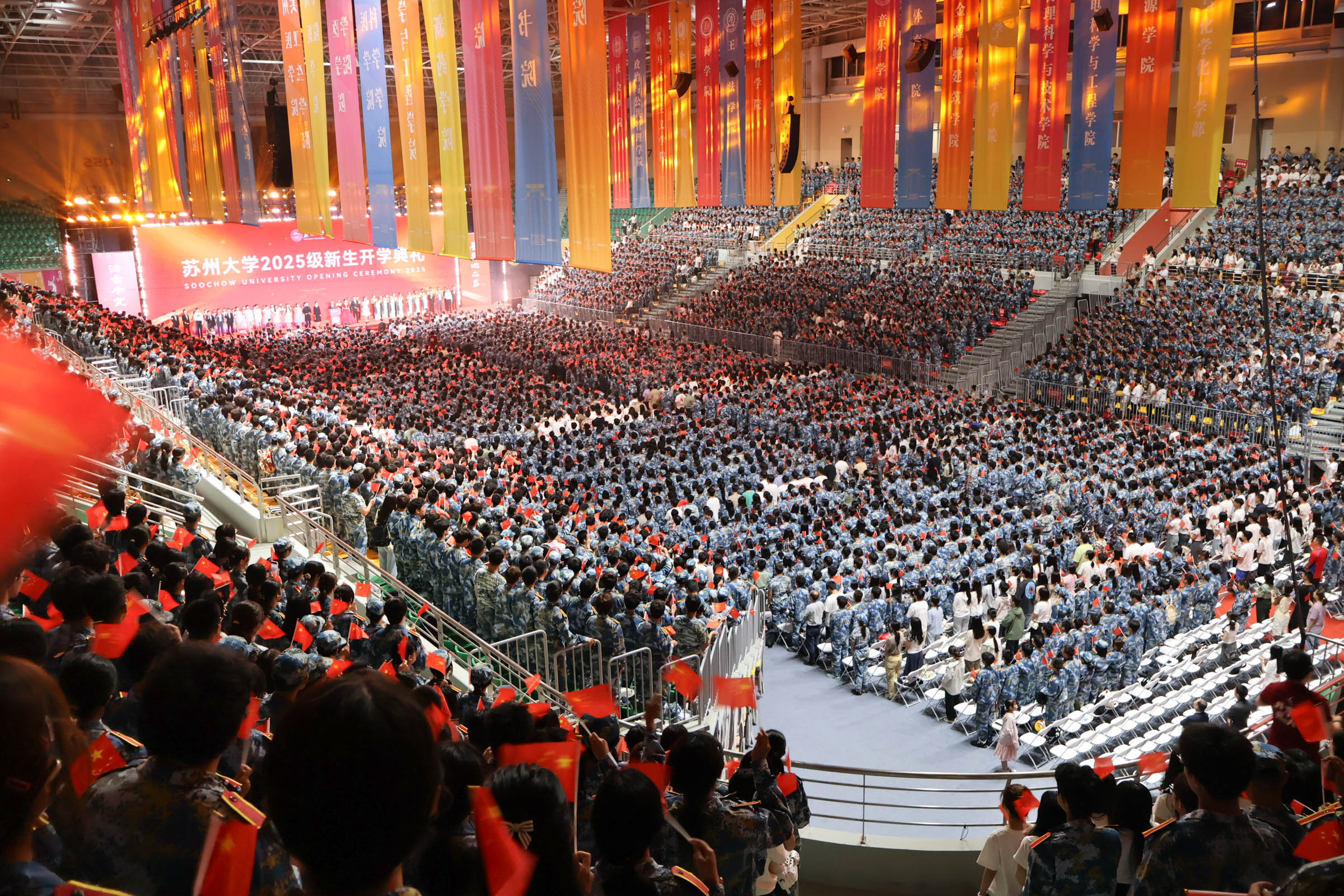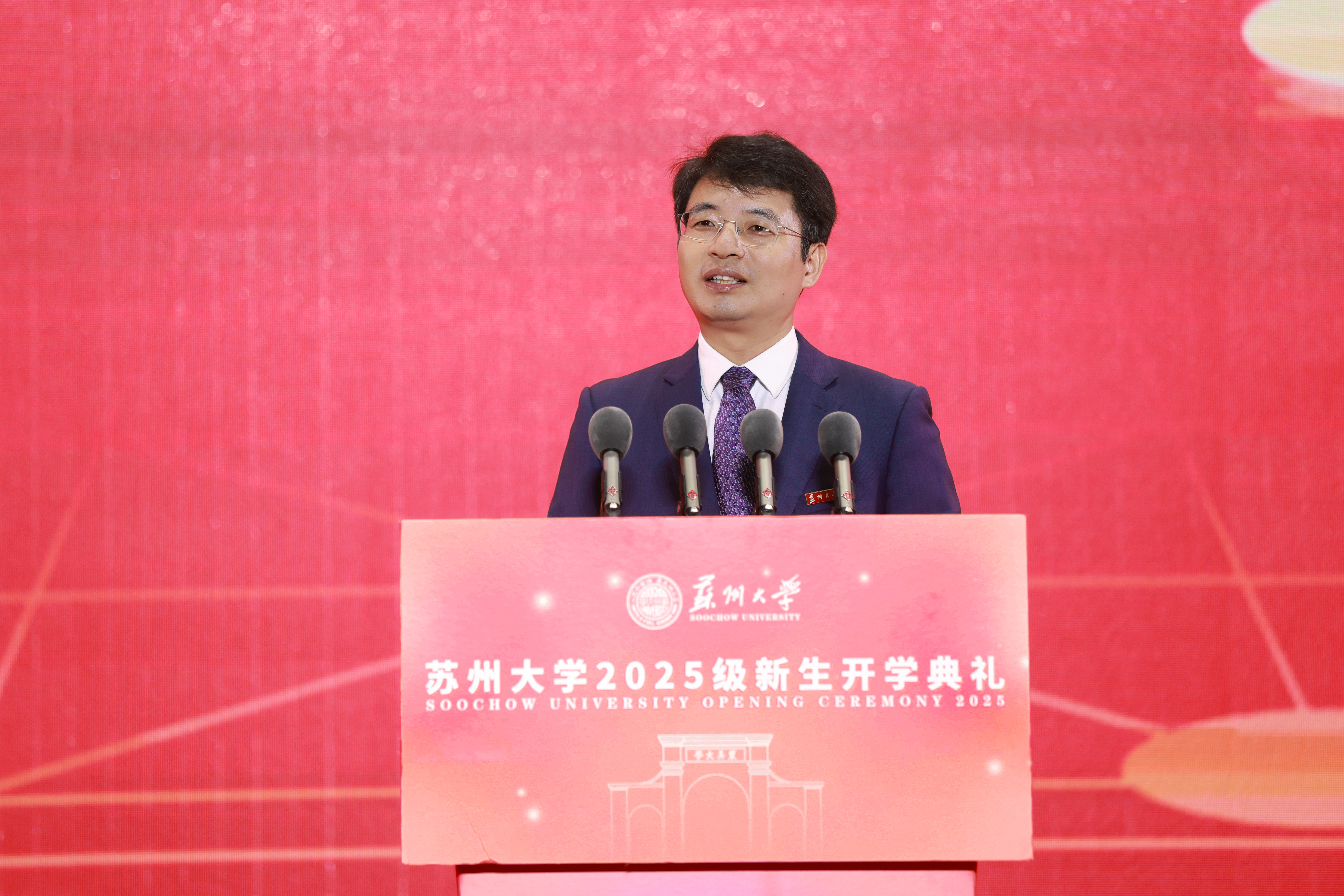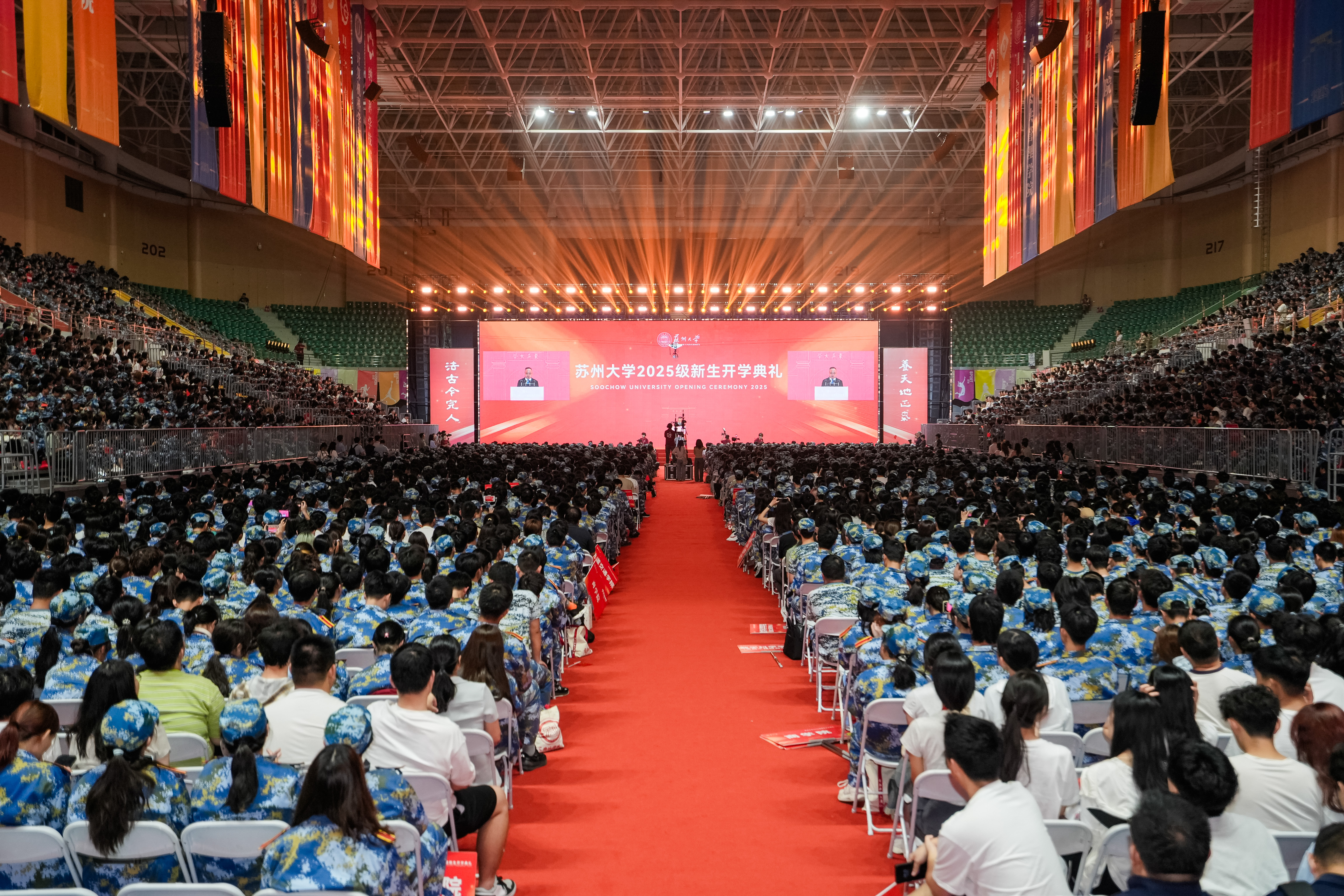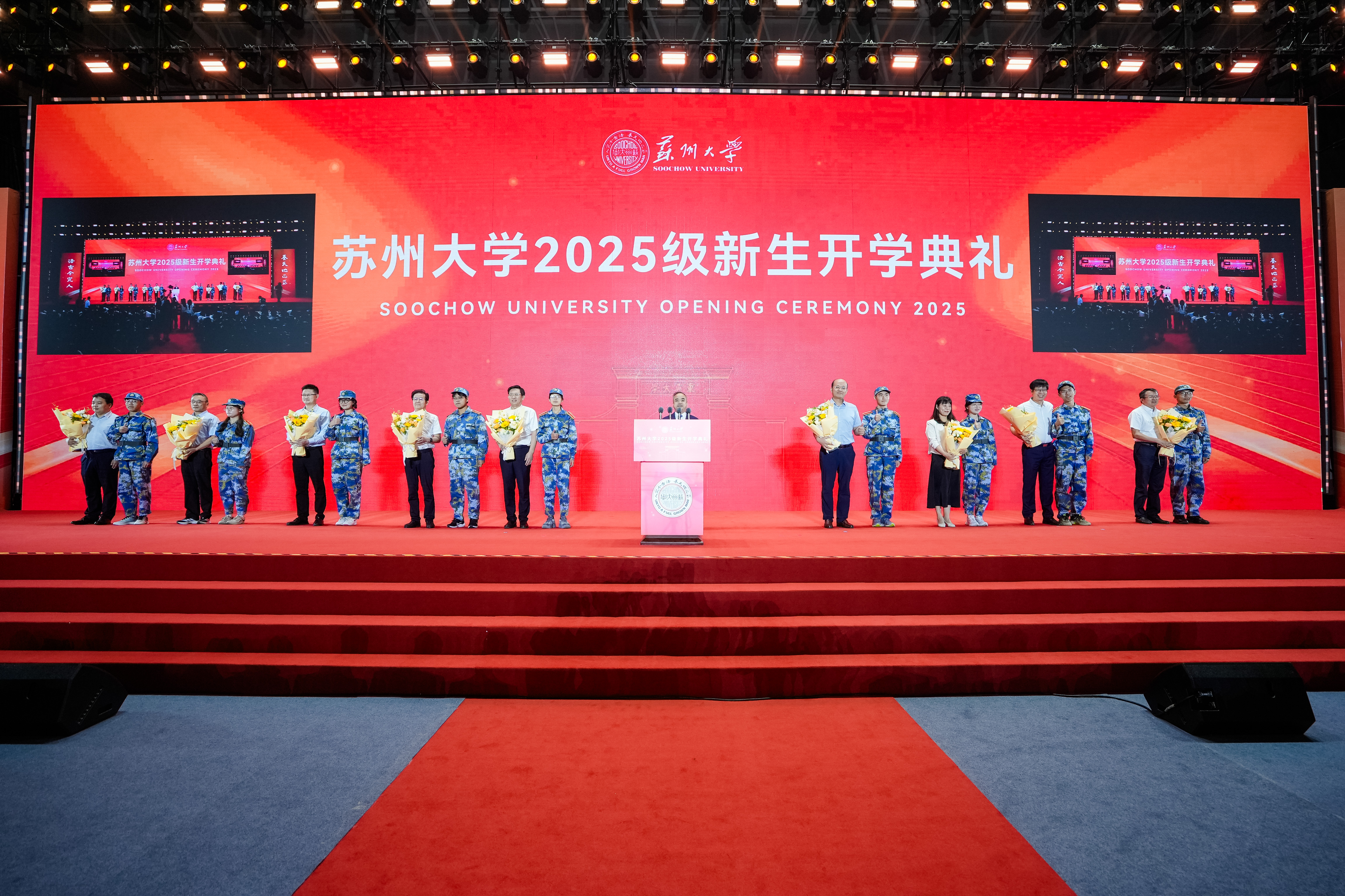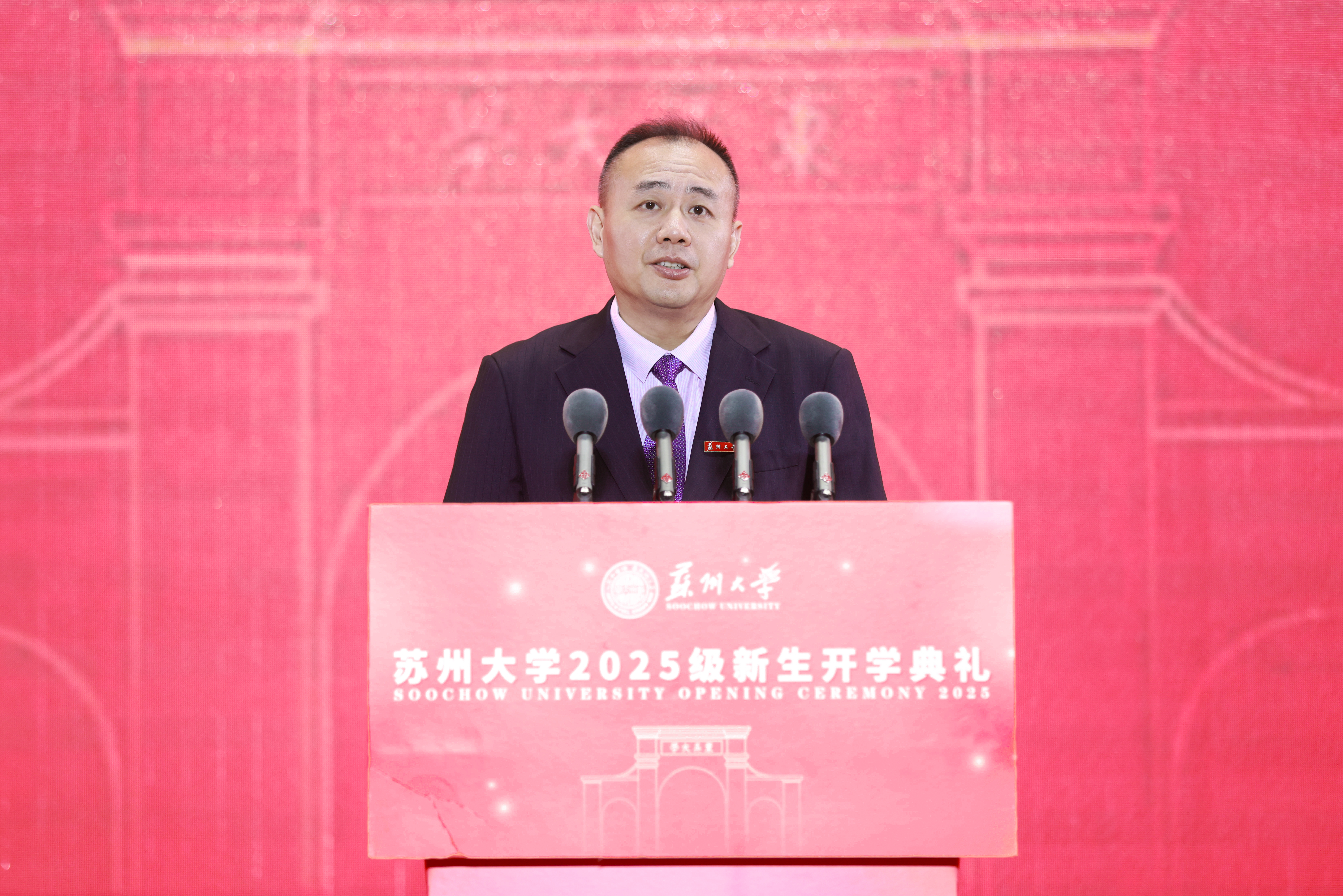 名城育名校,名校润名城。为欢迎2025级新生来到苏州这片热土,苏州市委市政府特别准备了一份满载心意的“新生礼包”。金洁、张晓宏、张桥共同上台开启赠礼。