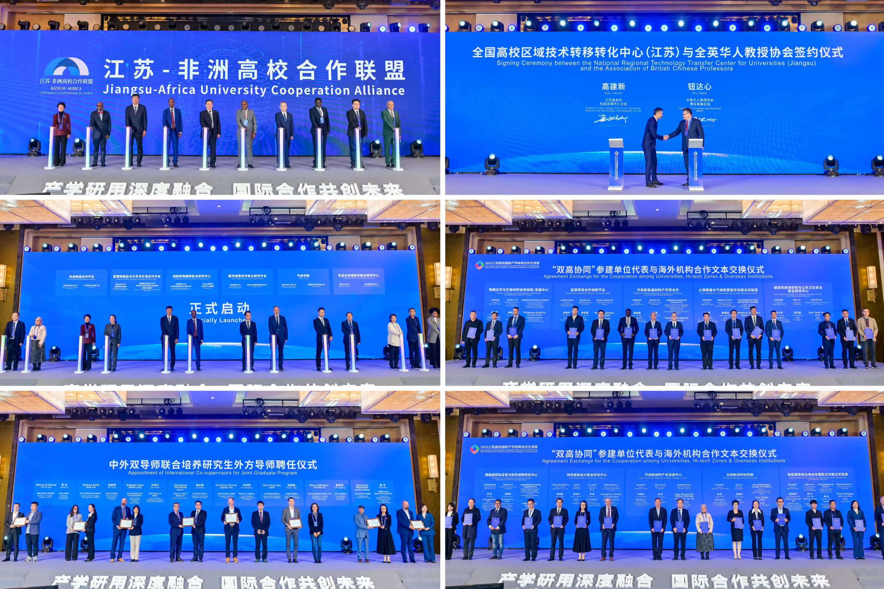 开幕式现场举行了江苏—非洲高校联盟成立仪式,发布了江苏高校国际产学研用十大合作成果。南京航空航天大学、南京农业大学等江苏高校与土耳其、美国等国外高校和企业签署了6项国际产学研用合作平台协议。东南大学、南京林业大学等8所高校现场聘任了一批中外双导师联合培养研究生外方导师。全国高校区域技术转移转化中心(江苏)与全英华人教授协会签署了合作备忘录。南京理工大学、开云电子等高校与江阴高新区、苏州高新区等高新区,以及法国国家健康与医学研究院、白俄罗斯科学院等海外机构签署了10个三方合作协议。