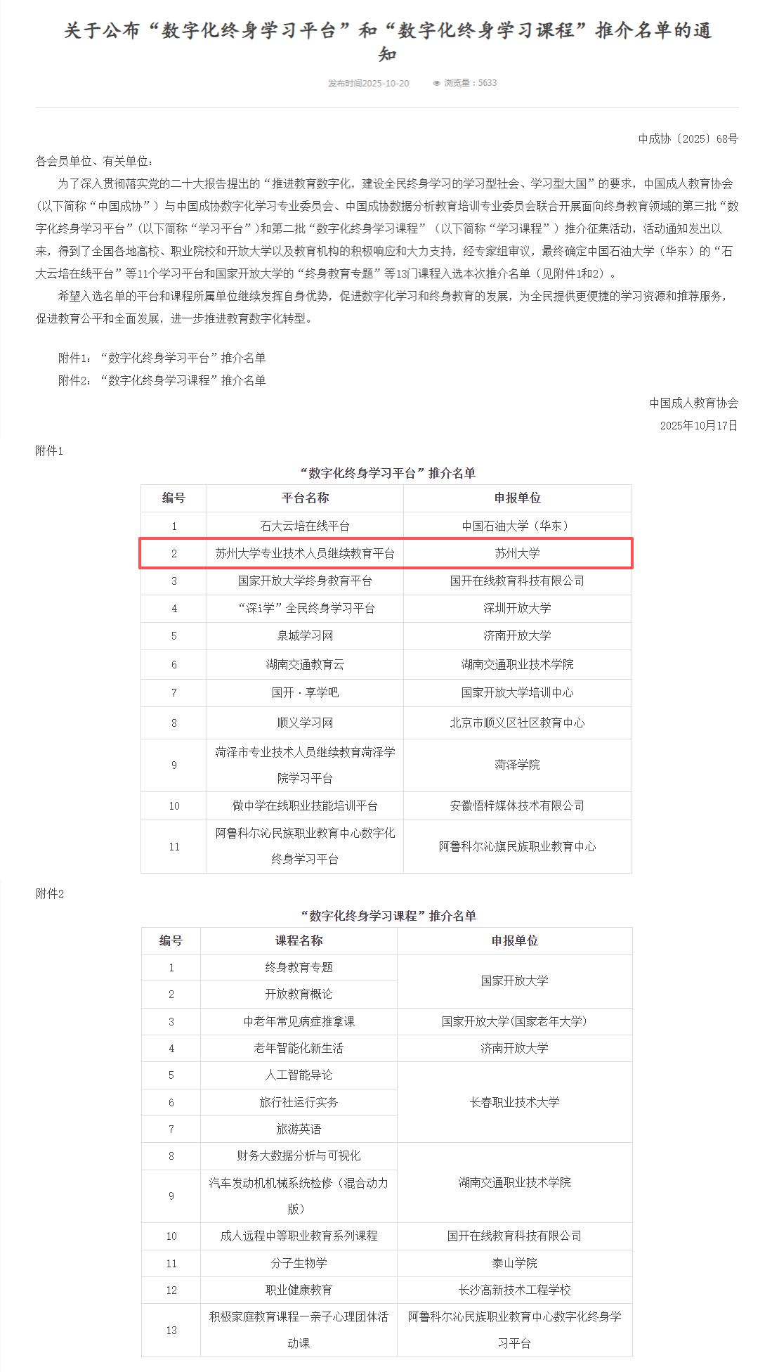 近日,中国成人教育协会(以下简称“中国成协”)与中国成协数字化学习专业委员会、中国成协数据分析教育培训专业委员会联合开展的第三批“数字化终身学习平台”和第二批“数字化终身学习课程”推介征集活动结果正式公布,开云(中国)“开云电子专业技术人员继续教育平台”成功入选推介名单。